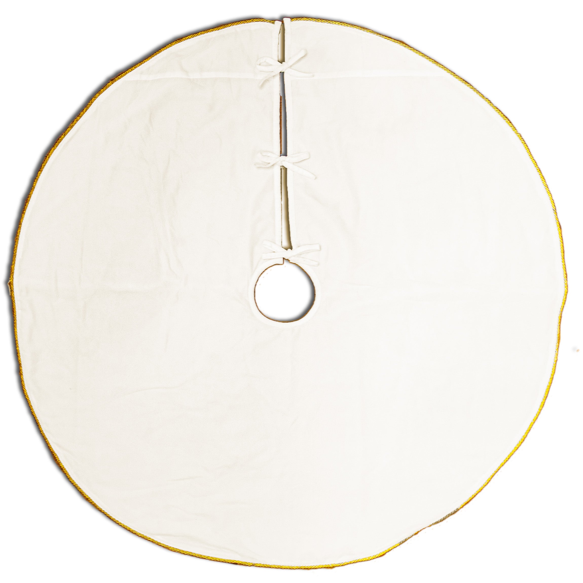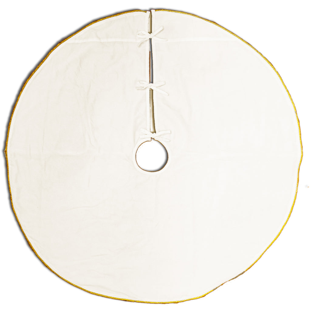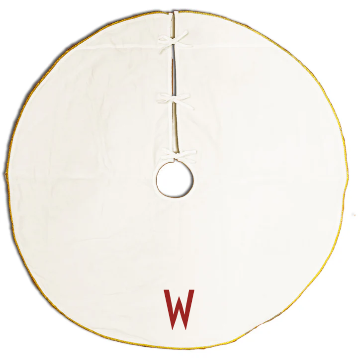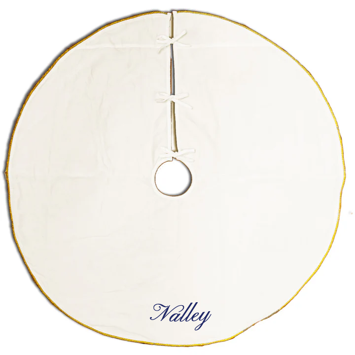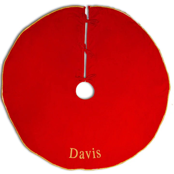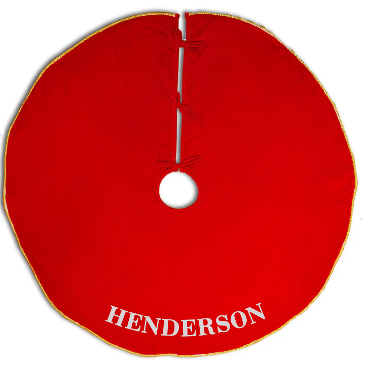 Wrap your Christmas tree in luxury with our 48" velvet tree skirt, monogrammed just for you at no extra cost. Choose classic red or elegant ivory, both trimmed in gold for a timeless holiday look.