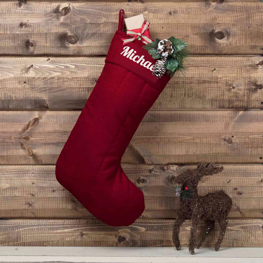 Stockings are a special Christmas decoration hung at the heart of the home where family and friends gather and make memories. Create a bespoke stocking for your mantle this season in our Embroidery Design Studio where you will find beautiful fonts and designs that promise to delight. Our Red Felt Stocking is fit for many different decor styles and offers the perfect finishing touch to your Christmas decor. Beautifully featuring a solid classic Christmas red felt with vertical channel hand-quilting on the body, accented with a turned cuff at the top and a loop for easy hanging.