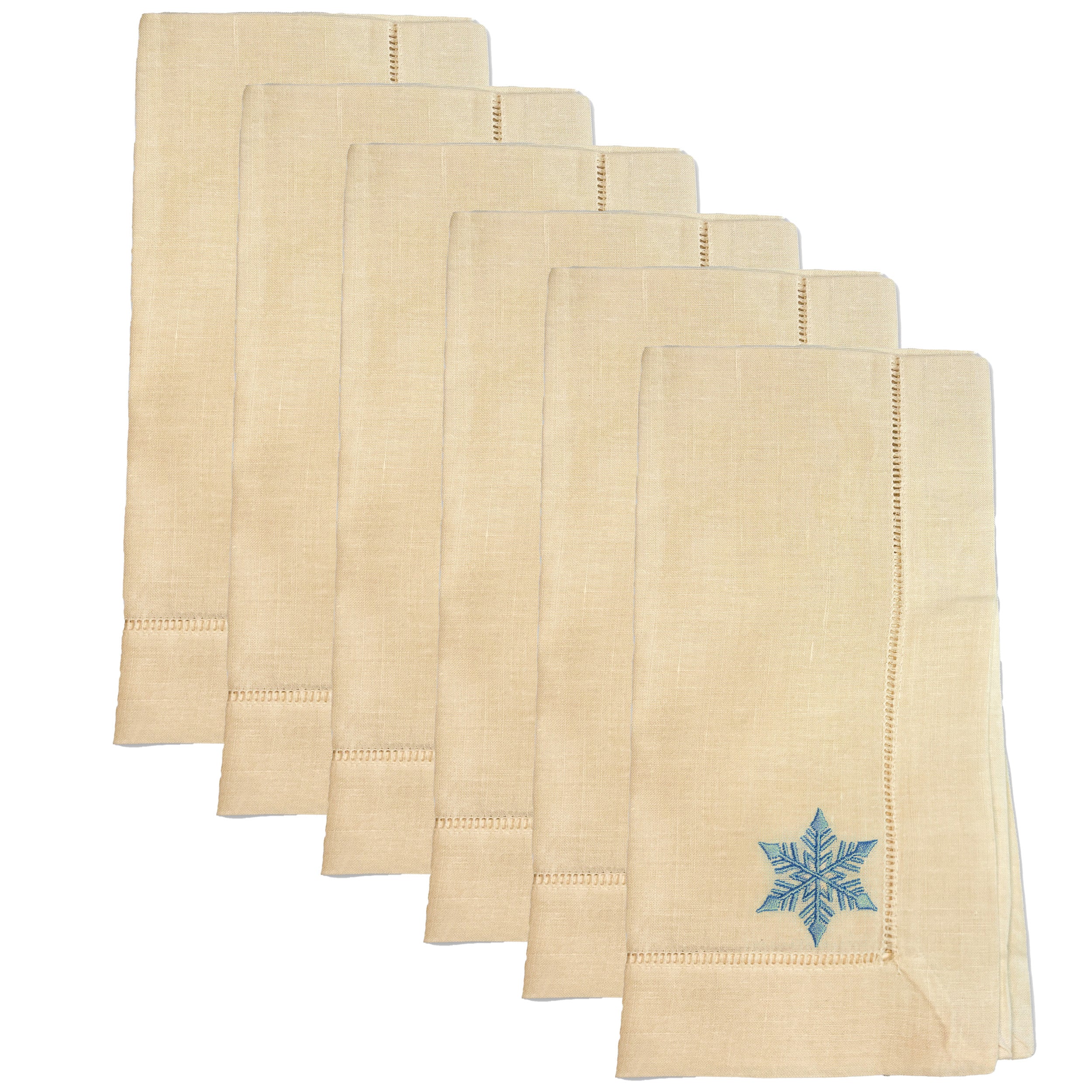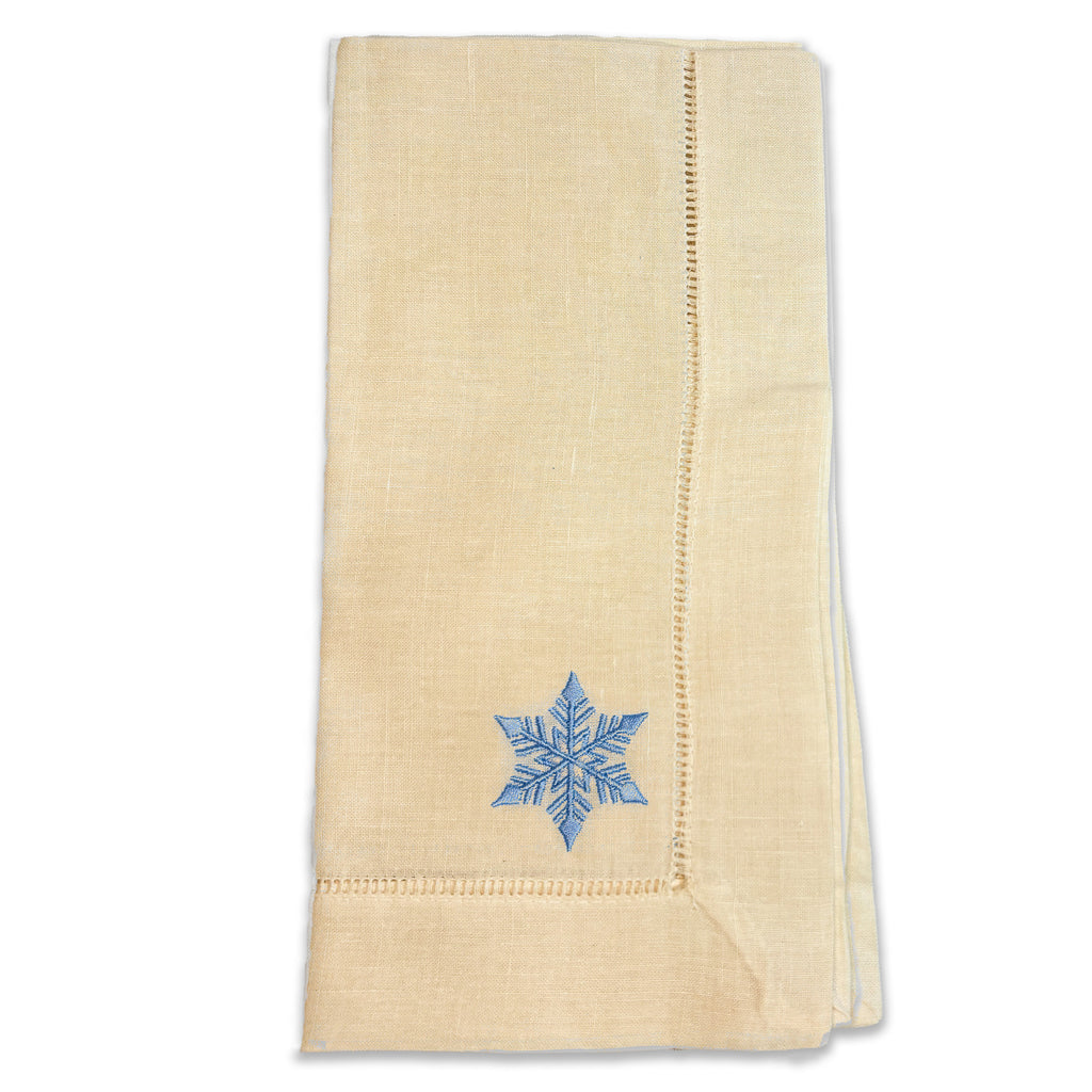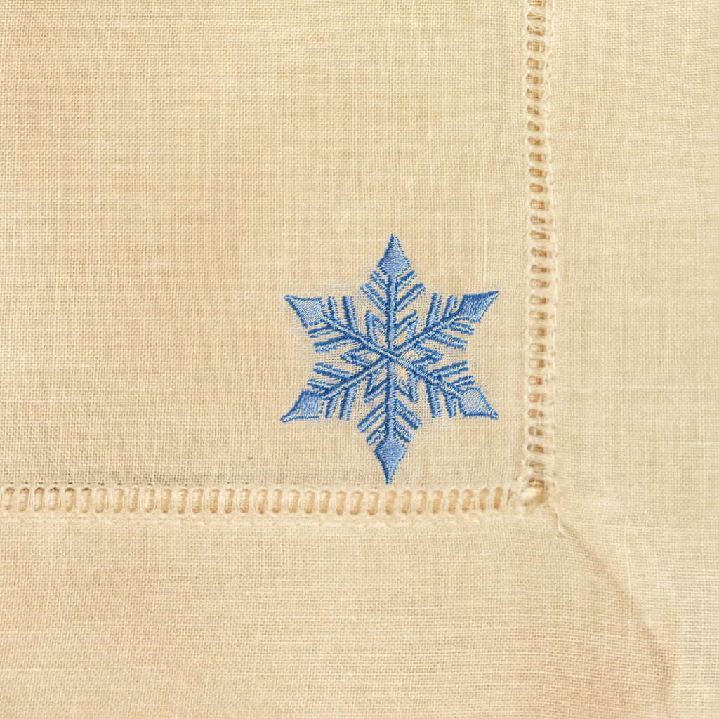 Our 20x20" dinner napkins blend classic style with everyday luxury. Each set of six features a crisp single hemstitch and a wintery snowflake delicately embroidered for a seasonal touch.