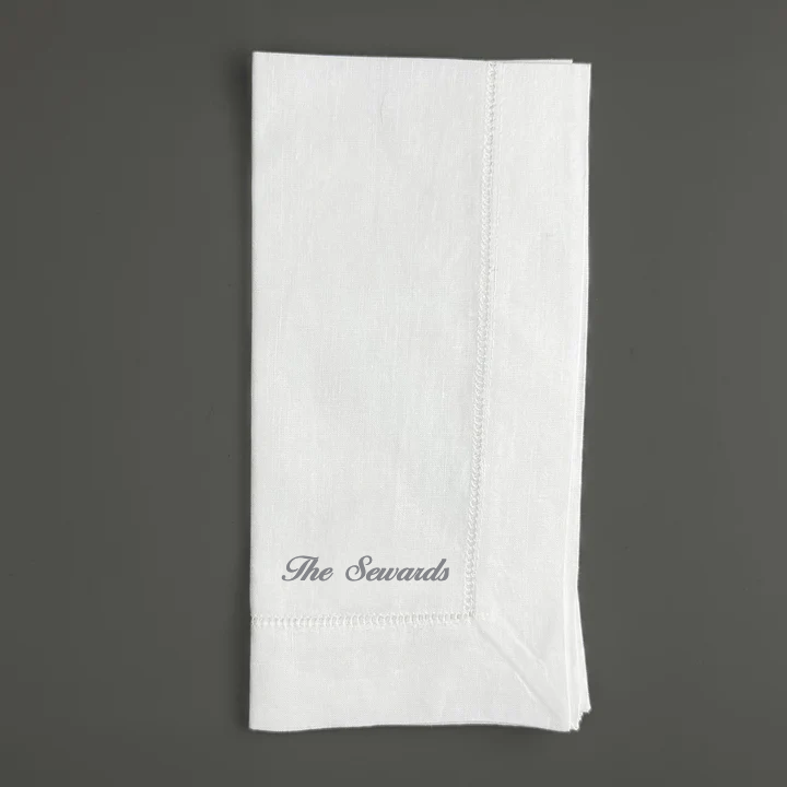 Personalize your table with our 20x20" linen-cotton dinner napkins, featuring a classic hemstitch and your custom name or saying. This set of six blends 55% linen and 45% cotton for softness, durability, and easy care—perfect for any occasion.
